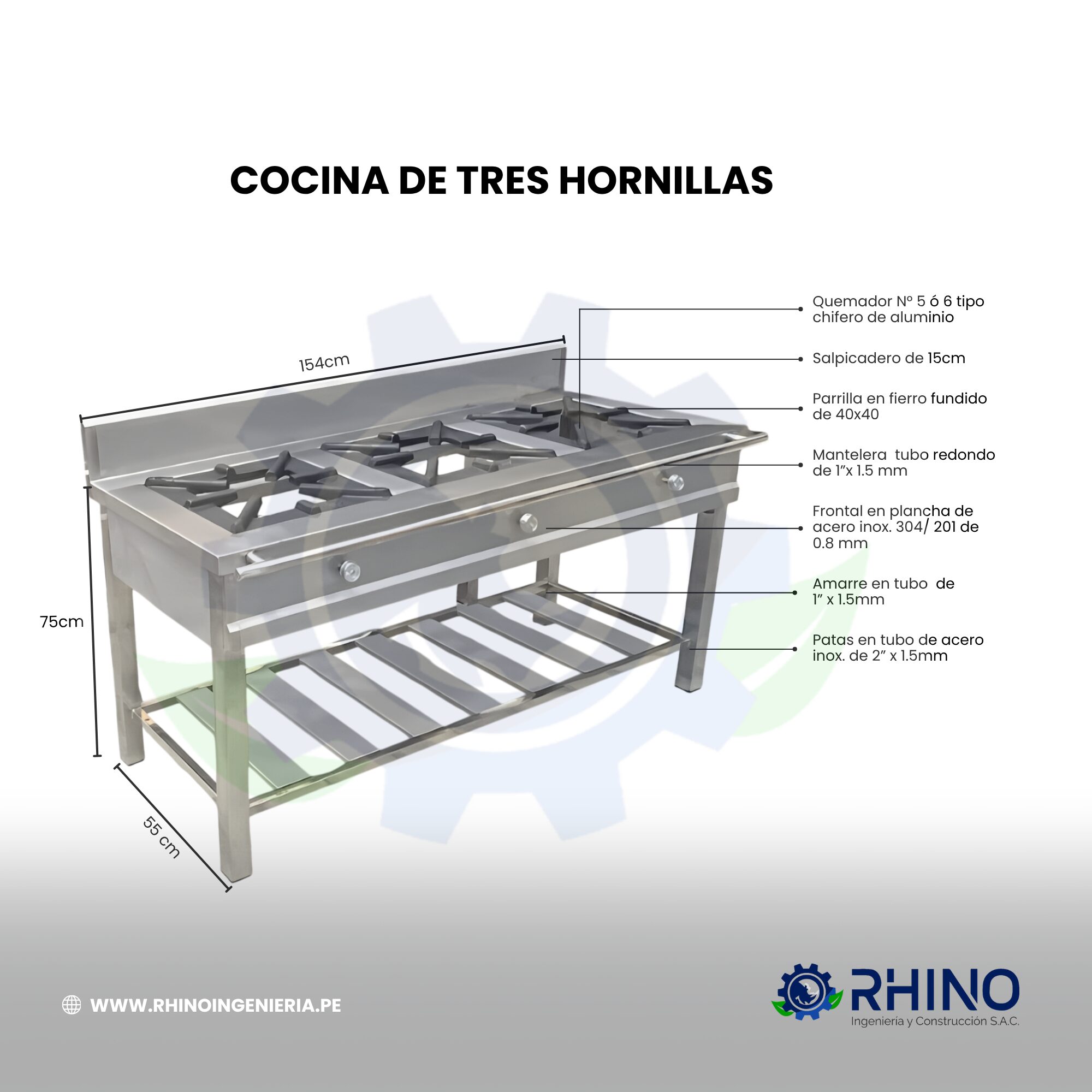 📏 Con dimensiones de 154×55×75 cm, esta cocina es amplia, robusta y diseñada para maximizar la productividad en restaurantes, hoteles, pollerías, caterings y todo negocio que demande alto desempeño diario.